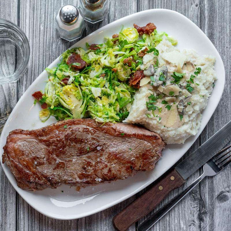 8oz Wagyu, made to order, with our signature brussel sprouts and your choice of salad or French onion soup